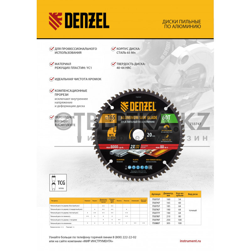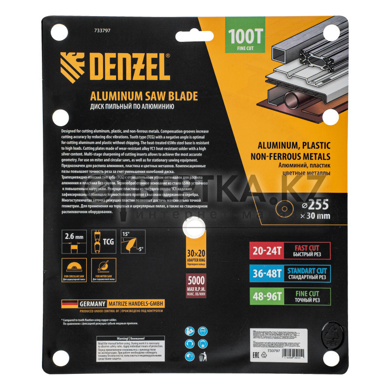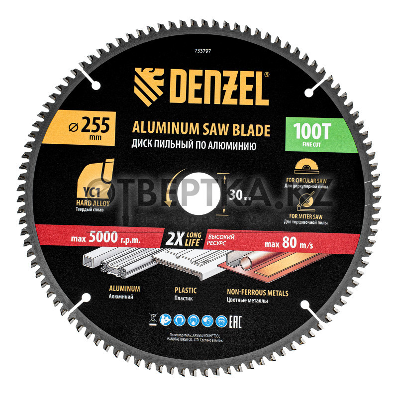 Пильный диск Denzel 733797 диаметром 255 x 30 мм, с 100 зубьями, предназначен для точного распиливания заготовок из алюминия, пластика, цветных металлов. Устанавливается на циркулярную или торцовочную пилу, также возможно использование с распиловочным станком. Зубья трапециевидно-плоского типа (TCG) с отрицательным углом заточки обеспечивают ровный рез без сколов. В комплект поставки входит переходное кольцо 30/20 мм, позволяющее изменить посадочный диаметр при необходимости.