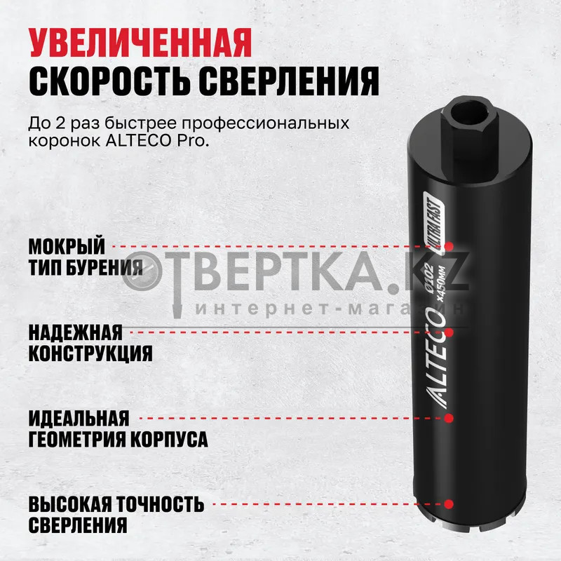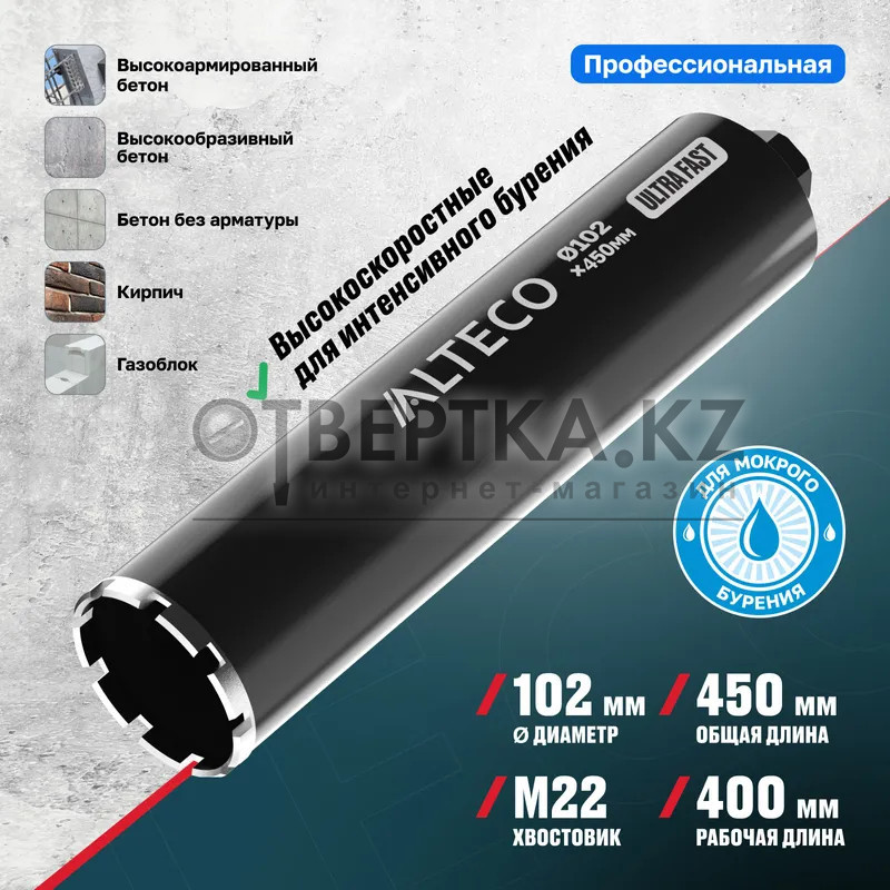Алмазные коронки ALTECO Ultra Fast профессиональные алмазные коронки, созданные для максимально быстрой работы по бетону, кирпичу и камню. Используются при мокром бурении, что снижает перегрев и продлевает срок службы инструмента. Подходят для интенсивной эксплуатации на строительных объектах и при монтаже инженерных систем.