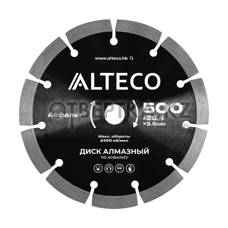 Диск алмазный ALTECO 500x25.4x3.6мм - применяется для сухого реза по асфальту. Толщина алмазного сегмента - 3.6 мм.