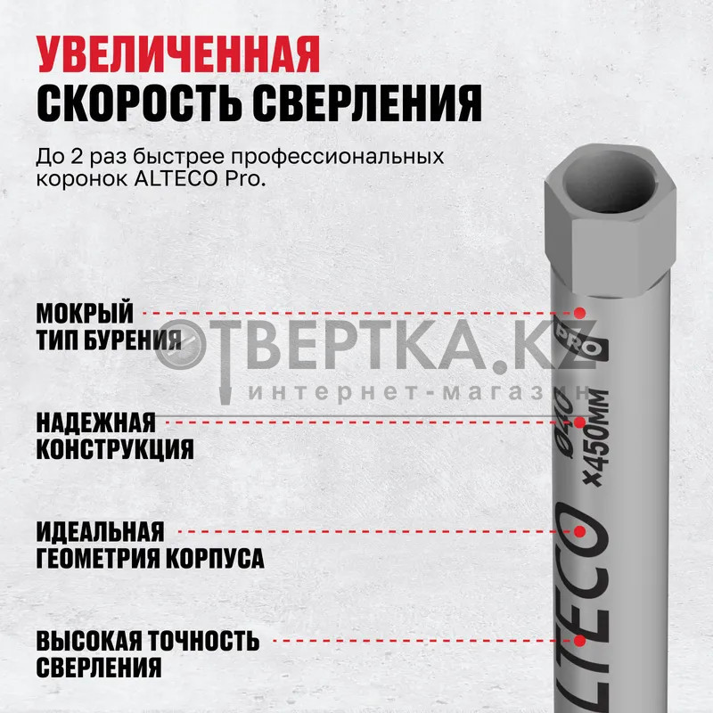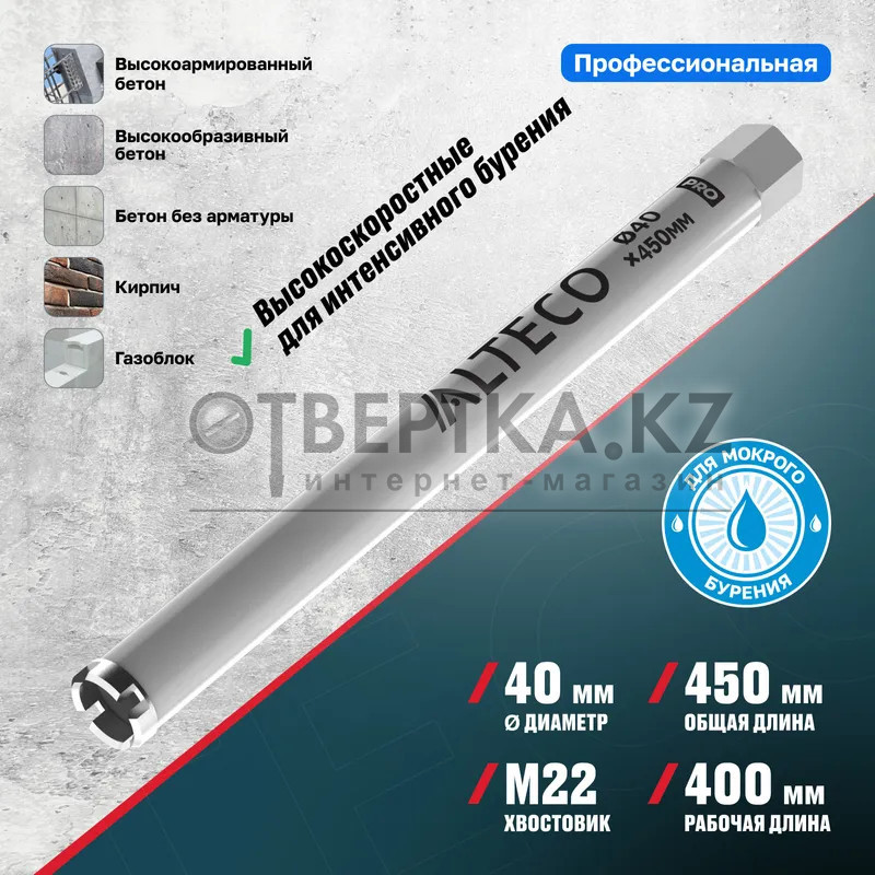Алмазные коронки ALTECO Pro надежные профессиональные коронки для мокрого бурения. Обеспечивают высокую точность и чистоту отверстий, сохраняя стабильную скорость даже при работе с армированным бетоном. Подходят для интенсивной эксплуатации на строительных объектах и при монтаже инженерных систем.