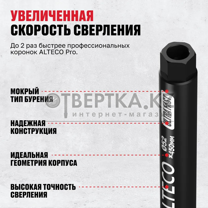 Алмазные коронки ALTECO Ultra Fast профессиональные алмазные коронки, созданные для максимально быстрой работы по бетону, кирпичу и камню. Используются при мокром бурении, что снижает перегрев и продлевает срок службы инструмента. Подходят для интенсивной эксплуатации на строительных объектах и при монтаже инженерных систем.