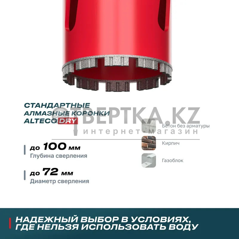 Алмазные коронки ALTECO DRY стандартная серия для сухого сверления. Предназначены для работы с бетоном и кирпичом в условиях, где нельзя использовать воду, например, в жилых помещениях или на высоте. Такой подход позволяет избежать лишней грязи, упрощает уборку и делает процесс более удобным.