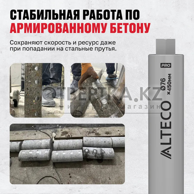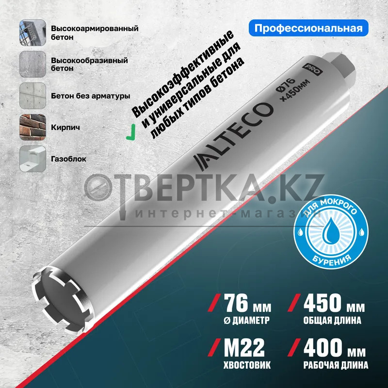 Алмазные коронки ALTECO Pro надежные профессиональные коронки для мокрого бурения. Обеспечивают высокую точность и чистоту отверстий, сохраняя стабильную скорость даже при работе с армированным бетоном. Подходят для интенсивной эксплуатации на строительных объектах и при монтаже инженерных систем.