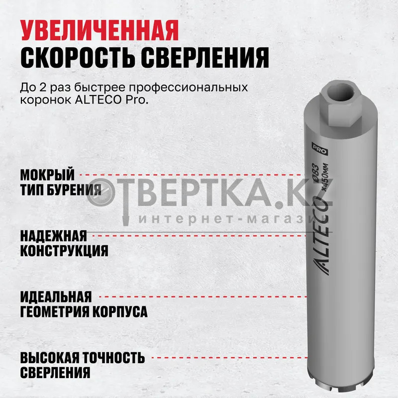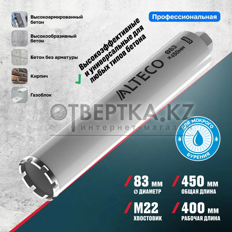 Алмазные коронки ALTECO Pro надежные профессиональные коронки для мокрого бурения. Обеспечивают высокую точность и чистоту отверстий, сохраняя стабильную скорость даже при работе с армированным бетоном. Подходят для интенсивной эксплуатации на строительных объектах и при монтаже инженерных систем.