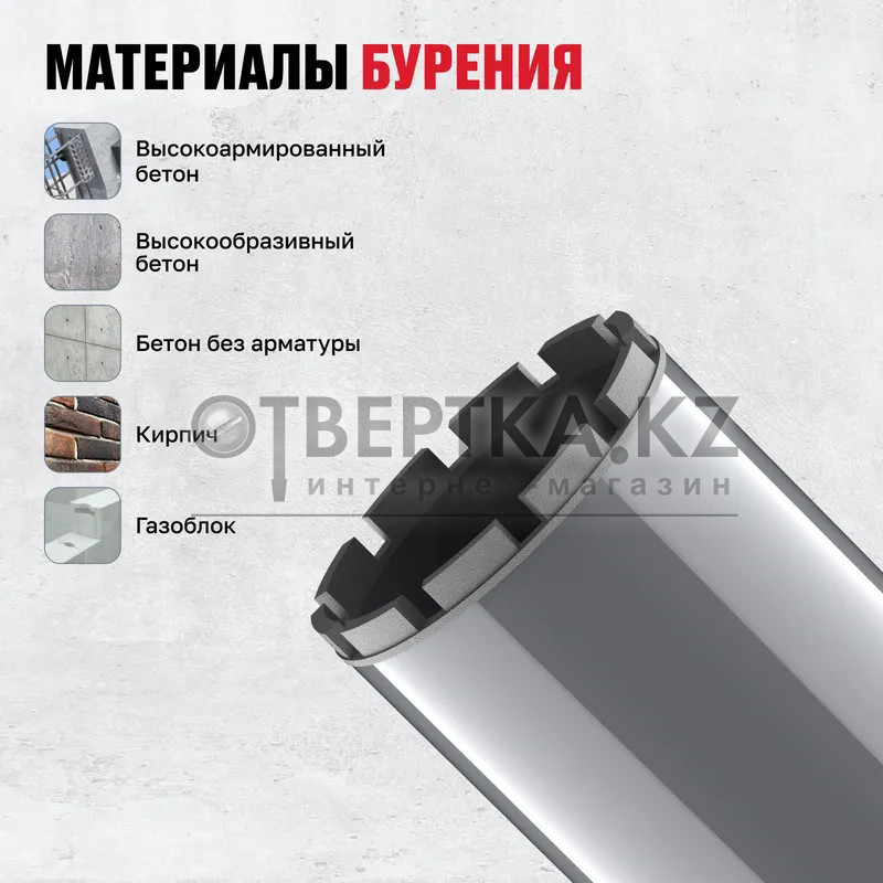 - Мокрый тип бурения — предотвращает перегрев и продлевает срок службы коронки.