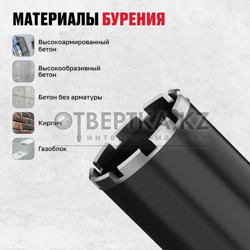 - Мокрый тип бурения — предотвращает перегрев и продлевает срок службы коронки.