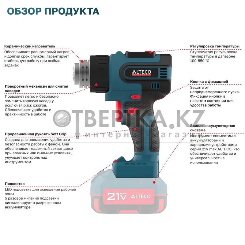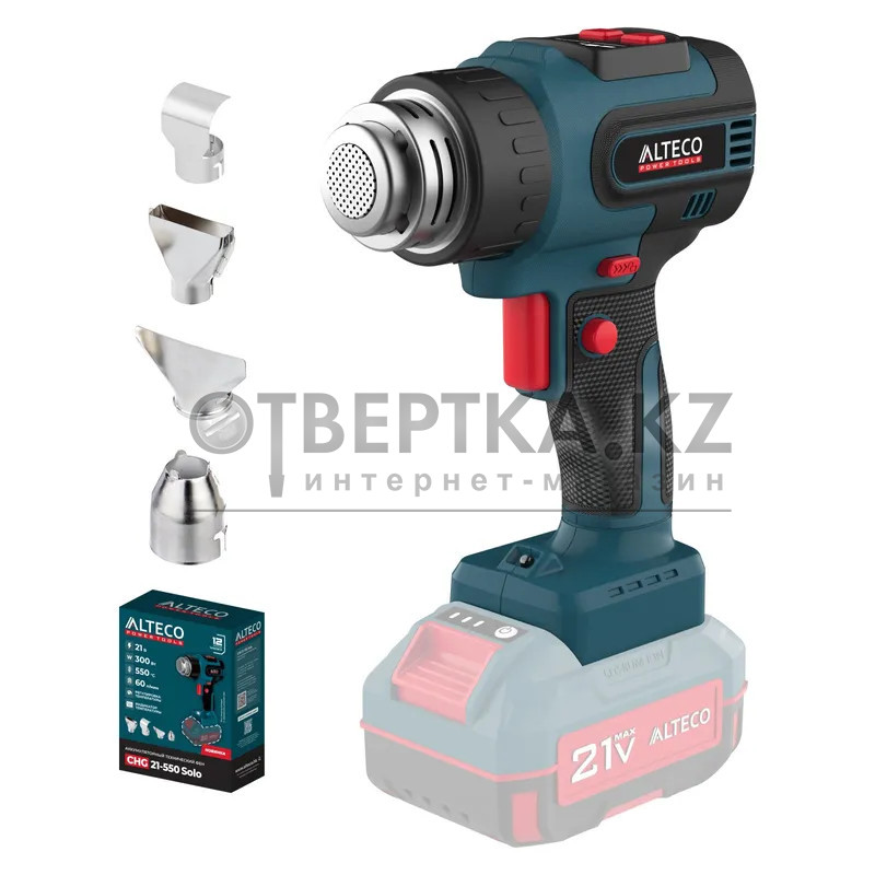 Аккумуляторный технический фен ALTECO CHG 21-550 Solo (без АКБ и ЗУ) - предлагает высокую производительность и универсальность для профессионалов и полупрофессионалов. Пять режимов температуры (100°C-550°C) и воздушный поток 60 л/мин обеспечивают точность для различных задач, от термоусадки до удаления краски. В комплекте четыре сменные насадки с функцией быстрой смены для удобства работы.