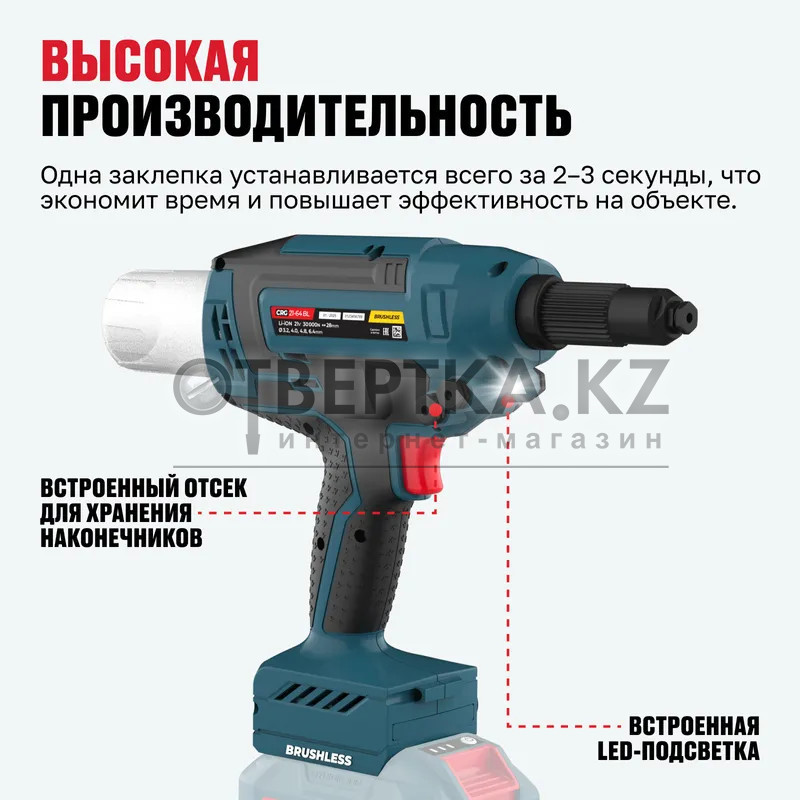 - Высокая производительность — одна заклепка устанавливается всего за 2–3 секунды, что экономит время и повышает эффективность на объекте.