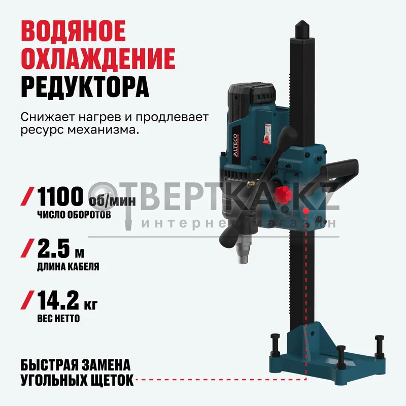 Машина алмазного бурения ALTECO DD 32-200 NWE — профессиональное оборудование для создания точных и чистых отверстий в бетоне, кирпиче и камне. Мощный двигатель 3200 Вт обеспечивает высокую производительность и уверенную работу даже в самых плотных материалах. Усиленный крутящий момент, прочная конструкция и водяное охлаждение гарантируют стабильность при длительных и тяжелых работ.