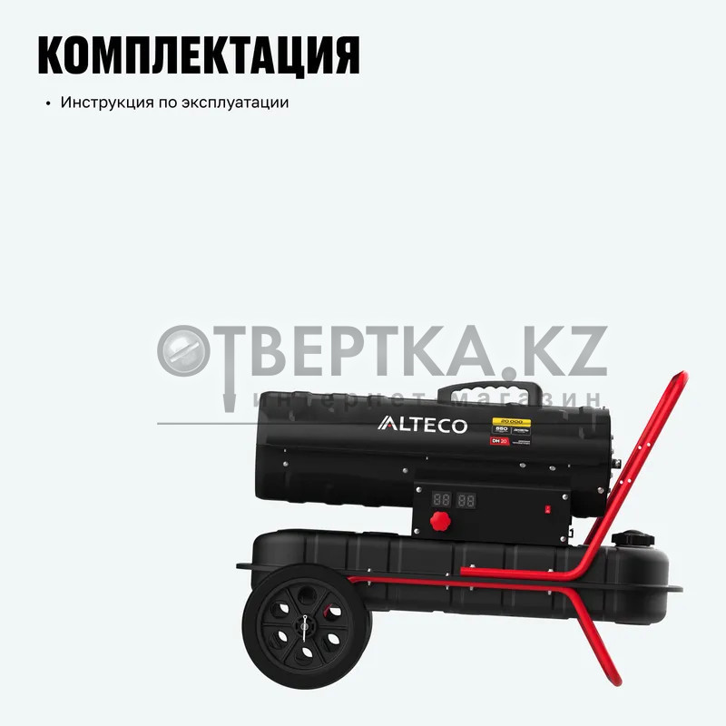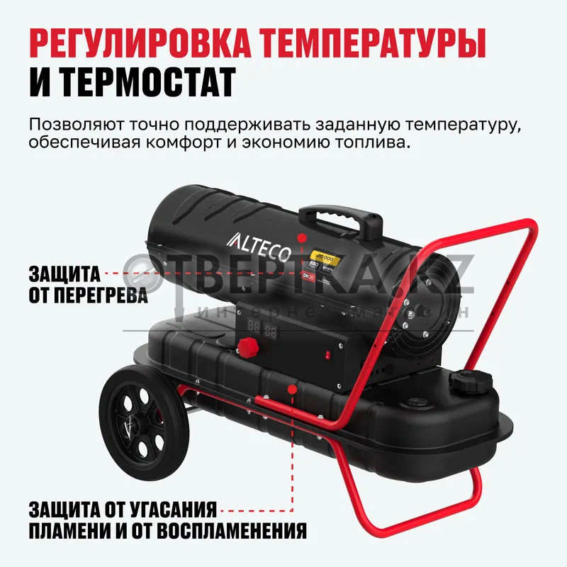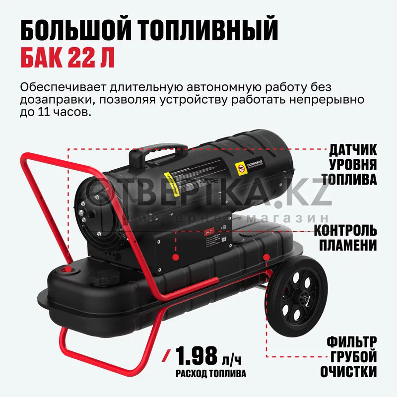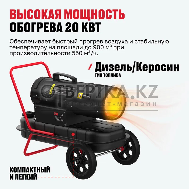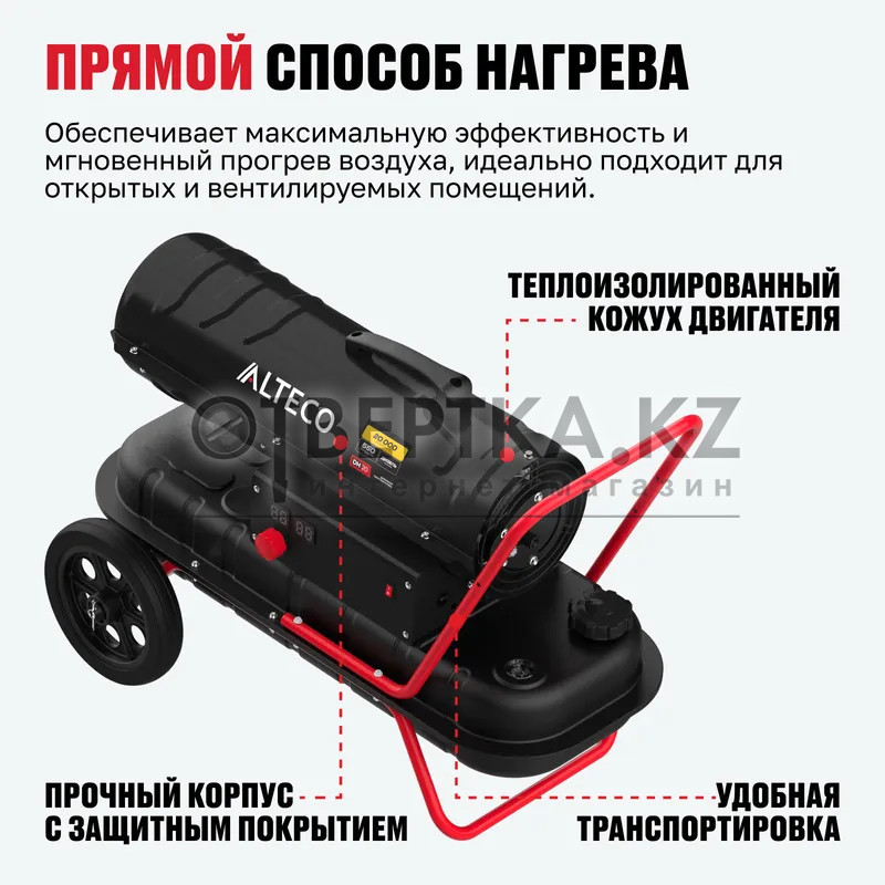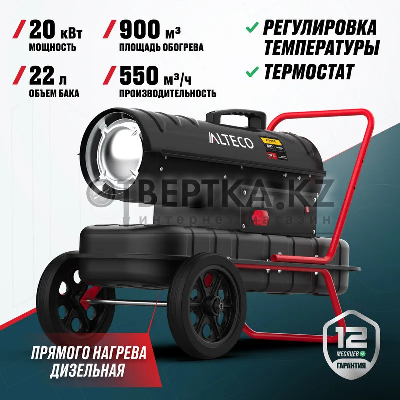 Дизельная тепловая пушка прямого нагрева ALTECO DH 20 предназначена для быстрого обогрева открытых и хорошо вентилируемых помещений - строительных площадок, ангаров, гаражей и складов. Тепловая пушка обеспечивает мгновенный нагрев воздуха и равномерное распределение тепла. Большой топливный бак позволяет работать без дозаправки до 11 часов, а встроенные системы контроля пламени и защиты от перегрева гарантируют безопасную эксплуатацию. DH 20 отличается высокой мощностью и эффективным расходом топлива, относится к категории профессионального оборудования.