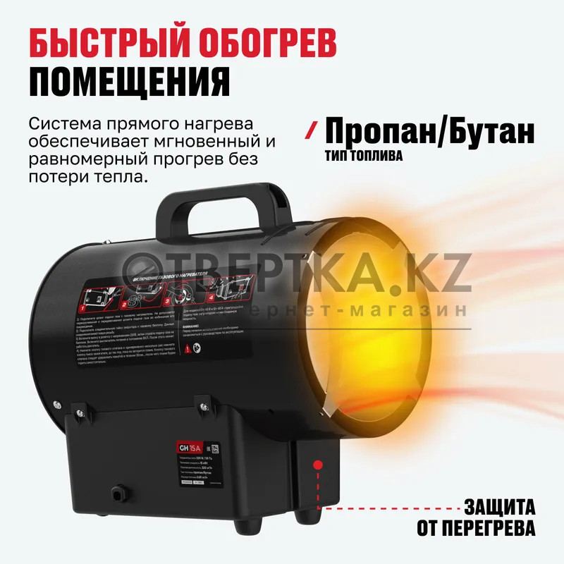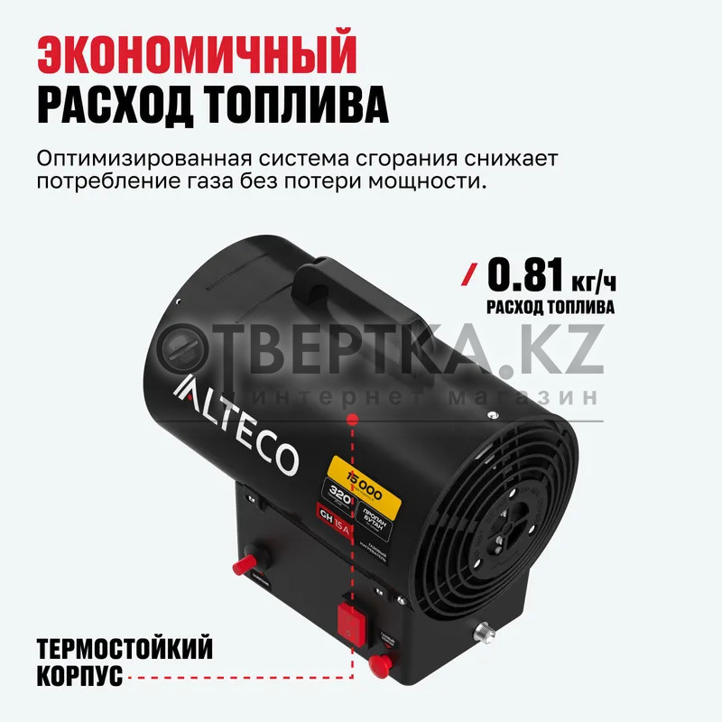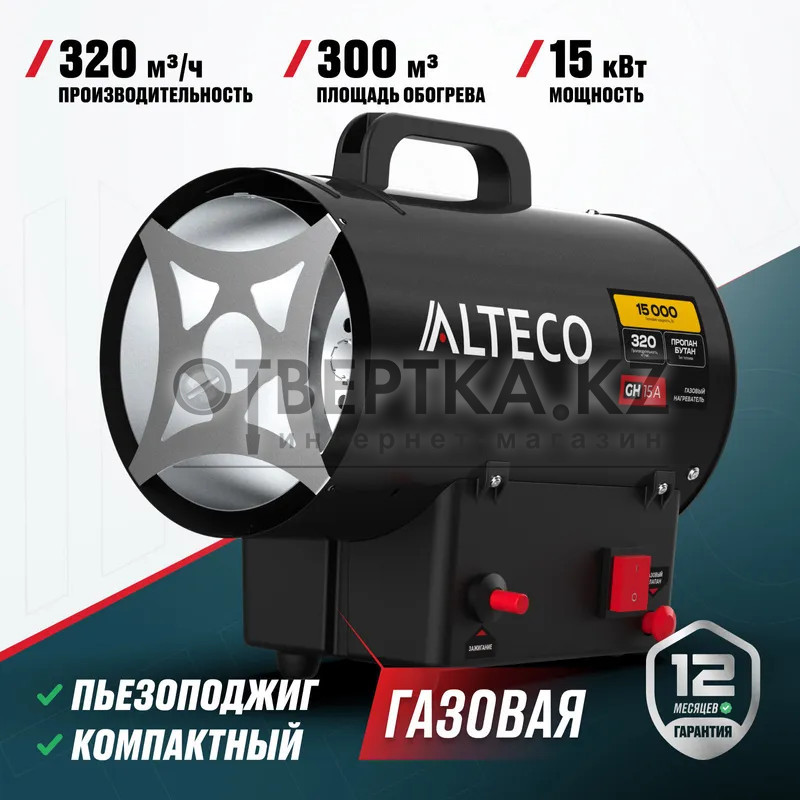 Газовый нагреватель ALTECO GH-15 A предназначен для быстрого обогрева помещений, строительных площадок, складов и мастерских. Прямой нагрев обеспечивает мгновенный прогрев воздуха и равномерное распределение тепла. Тепловая пушка отличается высокой производительностью при расходе воздуха до 320 м³/ч и экономичным потреблением топлива. Пьезоподжиг облегчает запуск, а встроенные системы защиты гарантируют безопасную эксплуатацию. GH 15 A относится к категории полупрофессионального оборудования, сочетая мощность и удобство использования.