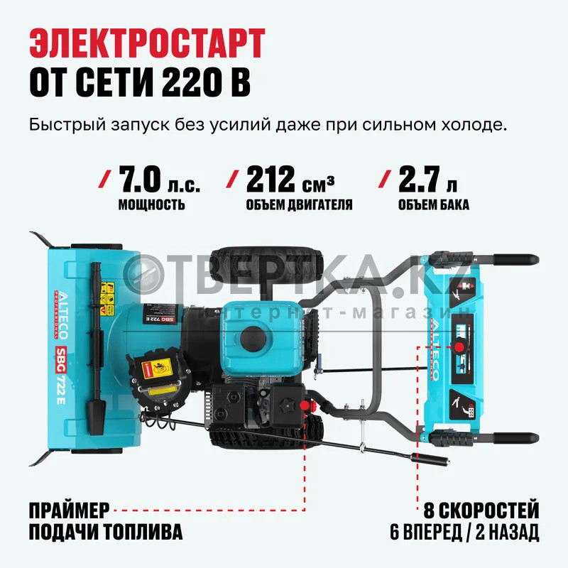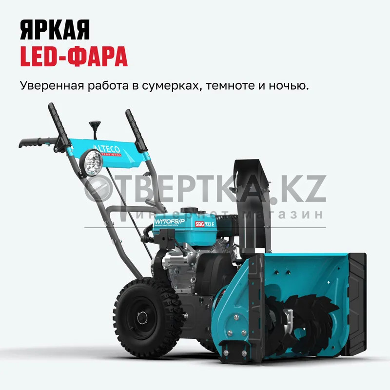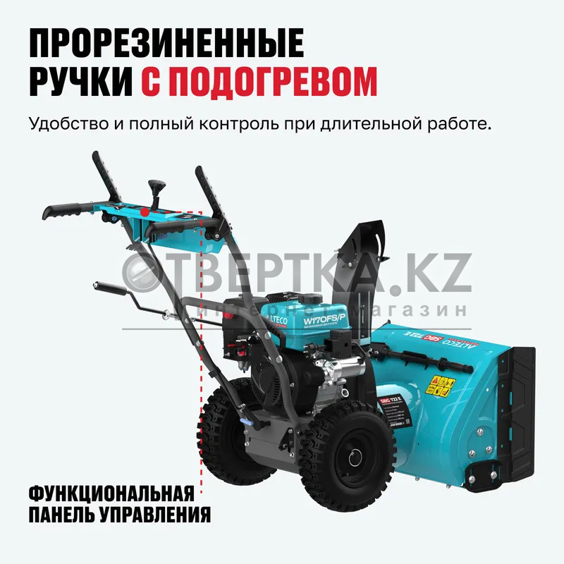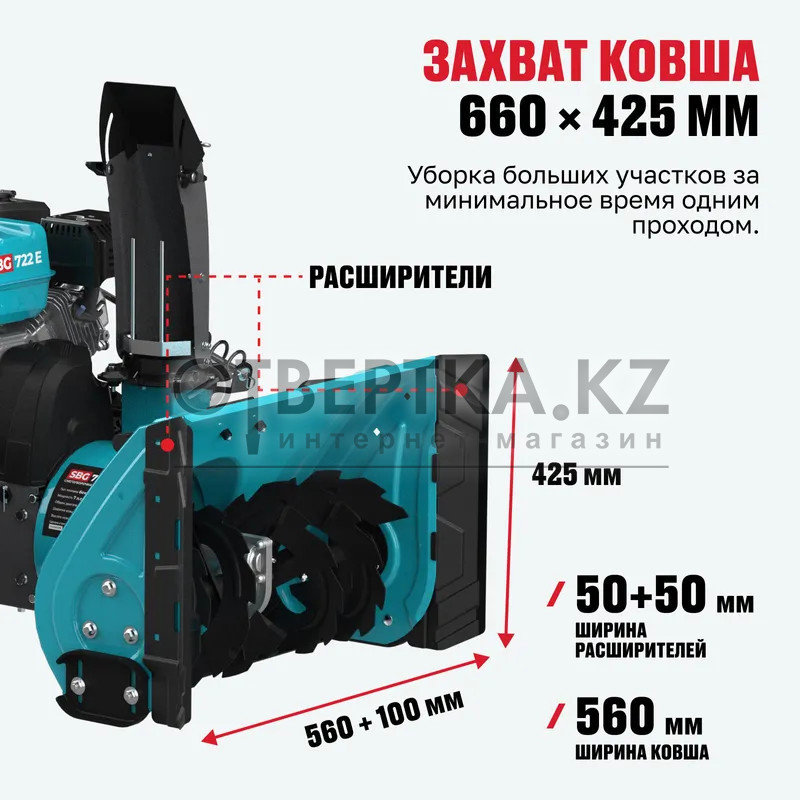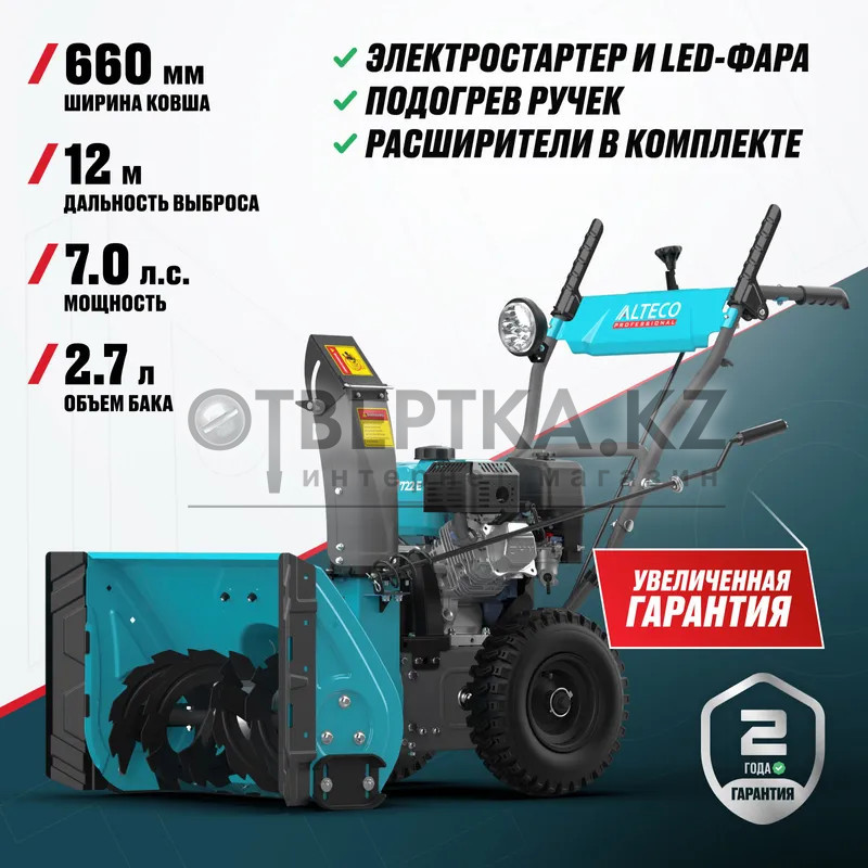 Бензиновая снегоуборочная машина ALTECO SBG 722 E – полупрофессиональная техника для удобной и эффективной уборки снега в частных хозяйствах, на придомовых участках и небольших коммерческих территориях. Двигатель мощностью 5,1 кВт (7 л.с.) обеспечивает надёжную работу при умеренных и сильных снегопадах. Рабочая ширина захвата 660 мм и высота обработки до 425 мм позволяют быстро очищать дорожки, дворы и подъездные пути. Оснащение электростартером и подогревом рукояток делает эксплуатацию комфортной даже в морозную погоду. В комплект входят расширители ковша 100 мм, что заметно ускоряет процесс уборки и повышает эффективность работы. Все это делает SBG 722 E оптимальным выбором для полупрофессионального использования.