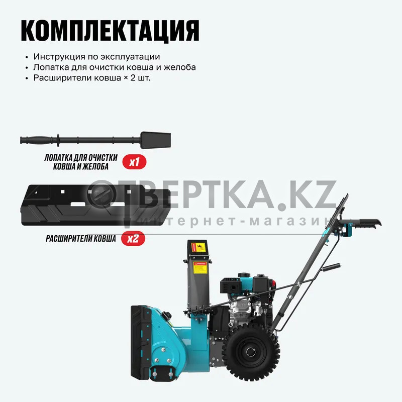 - Лопатка в комплекте — удобная очистка выбросного желоба от наледи и снега.