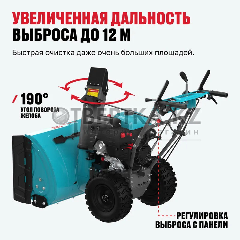 - Увеличенная дальность выброса до 12 м — быстрая очистка даже очень больших площадей.