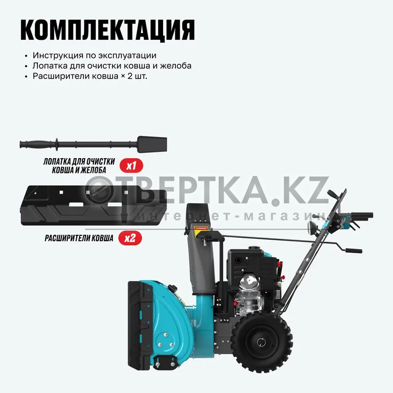 - Лопатка в комплекте — удобная очистка выбросного желоба от наледи и снега.