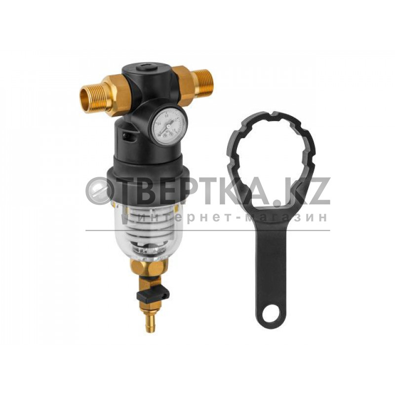 Латунный промывной механический фильтр с сеточным ступенчатым картриджем из нержавеющей стали, 100 микрон и прозрачной колбой. Используется для холодной воды