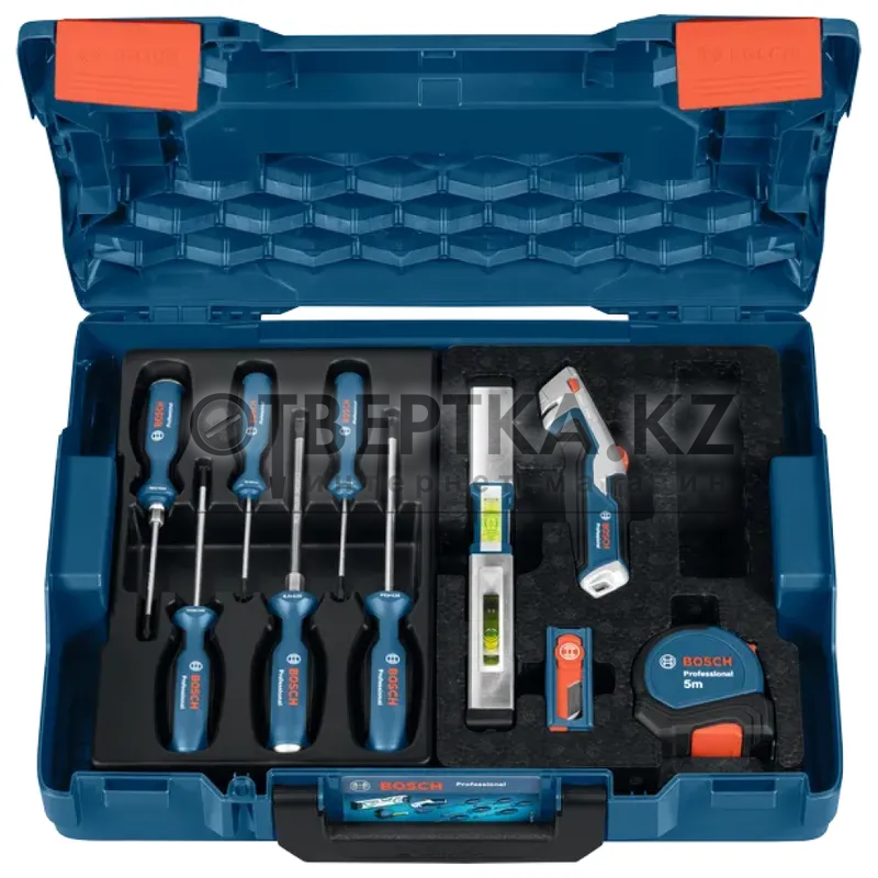 Набор инструментов Bosch 19 предметов 0615990N2R - ручные инструменты должны быть под рукой и готовы к работе. Поэтому предлагаем профессиональный набор ручного инструмента из 19 предметов в удобном кейсе L-BOXX 102. Он изготовлен из высококачественных материалов, таких как хромованадиевая сталь и алюминий, то есть отличается прочностью и долговечностью. Благодаря мягким накладкам и эргономичному дизайну инструмент очень удобен. В набор входят 6 различных отверток для вкручивания и выкручивания различных типов винтов (Phillips, шлицевые, Torx и Pozidriv), а также долота с металлическим ударным колпачком (PH1 и SL6.5). В комплект входят магнитный уровень 25 см со встроенной спиртовой колбой и магнитами, рулетка 5 м и выдвижной нож для ковровых покрытий с 10 сменными лезвиями. Отсек для лезвий позволяет хранить до 3 запасных лезвий. Эргономичная рукоятка упрощает использование, а широкий упор для большого пальца позволяет увеличивать приложенное усилие. Набор ручного инструмента поставляется в кейсе Bosch Professional L-BOXX 102 с 2 полувкладышами, благодаря чему все инструменты удобно лежат на своих местах, а весь набор легко транспортируется.