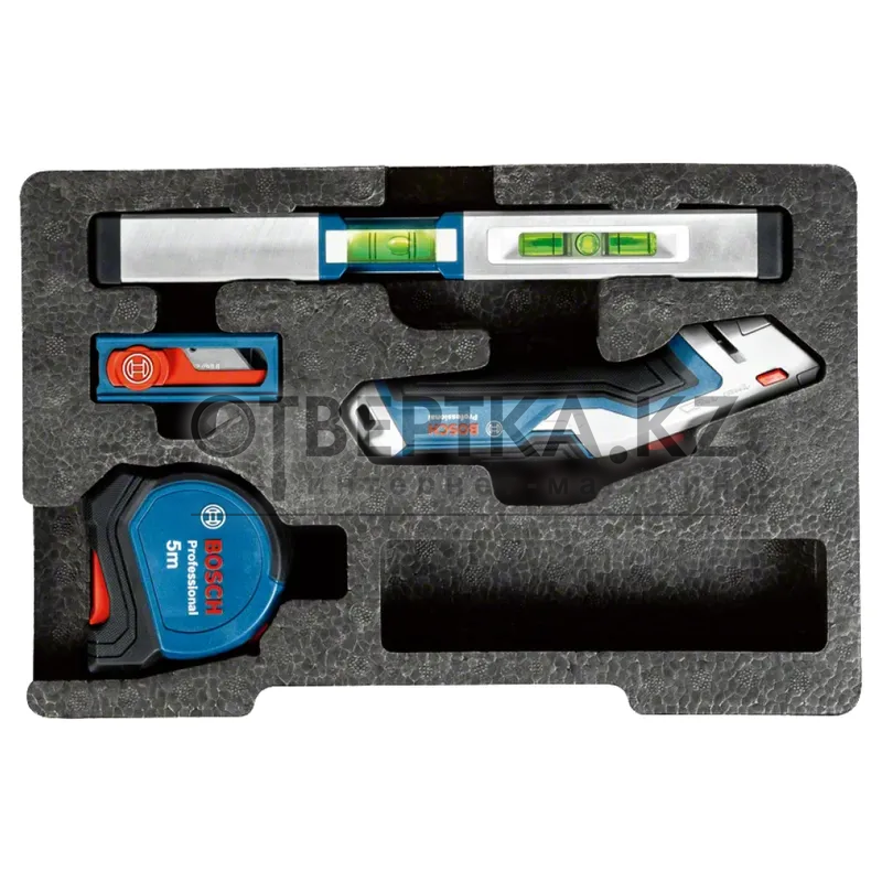 Комплект поставки: отвертки SL 3,5 / SL 6,5 / TX 15 / TX 20 / PH 1 / PZ 2, уровень 25 см (магнитный), рулетка 5 м, выдвижной нож для ковровых покрытий, 10 сменных лезвий. Два входящих в комплект поставки полувкладыша оптимизированы для Bosch Professional L-BOXX 102