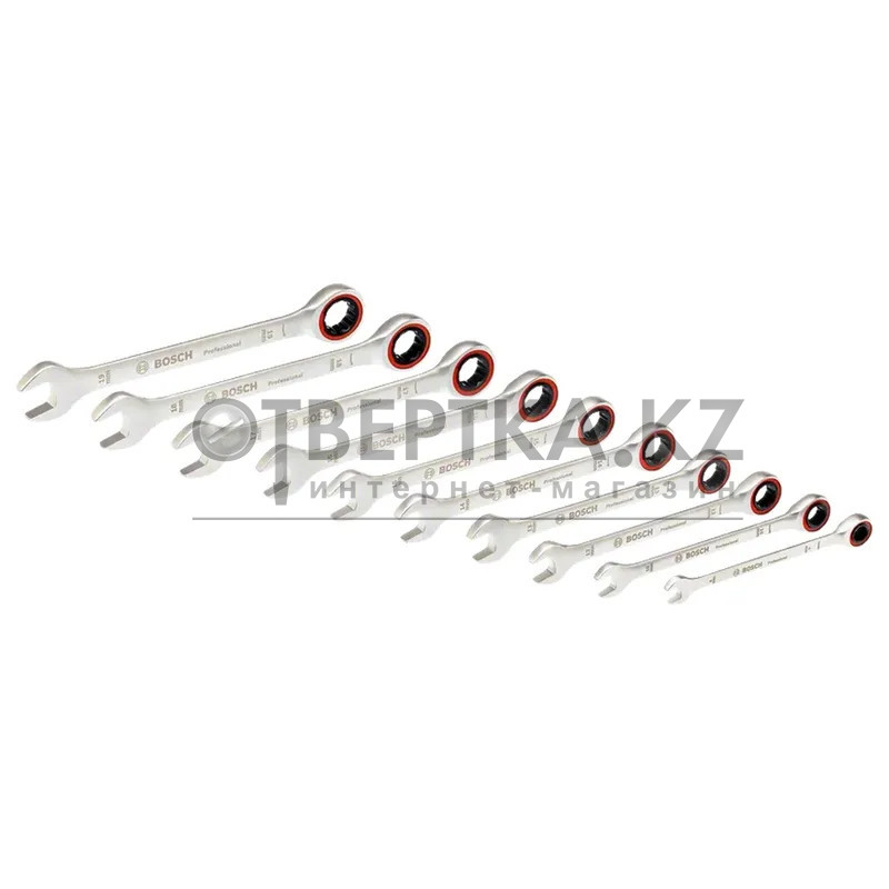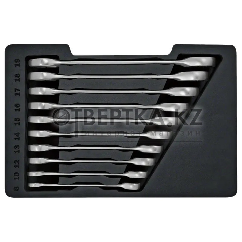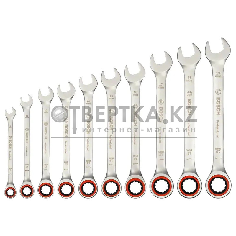 Набор гаечных ключей с трещоткой Bosch 10шт. 1600A02AU0 - универсальный набор из 10 гаечных ключей с храповым механизмом содержит ключи наиболее распространенных размеров. Все ключи универсальны, так как сочетают в себе накидной ключ, ключ с открытым зевом и храповый механизм. Все ключи прекрасно подходят для работы в ограниченном пространстве, поскольку храповый механизм позволяет работать с углом отведения менее 1 градуса. Гаечные ключи, изготовленные из высококачественной хром-ванадиевой стали с закаленным биметаллическим кольцом с шестигранным отверстием, отличаются прочностью и долговечностью. В набор из 10 ключей входят гаечные ключи с храповым механизмом следующих распространенных размеров: 8, 10, 12, 13, 14, 15, 16, 17, 18 и 19 мм. Гаечные ключи с храповым механизмом предназначены для прецизионного применения с малым и средним крутящим моментом. Для работы с большим крутящим моментом следует использовать гаечный ключ с открытым зевом. Набор поставляется в практичном полувкладыше, совместимом с Bosch L-BOXX системой Mobility.