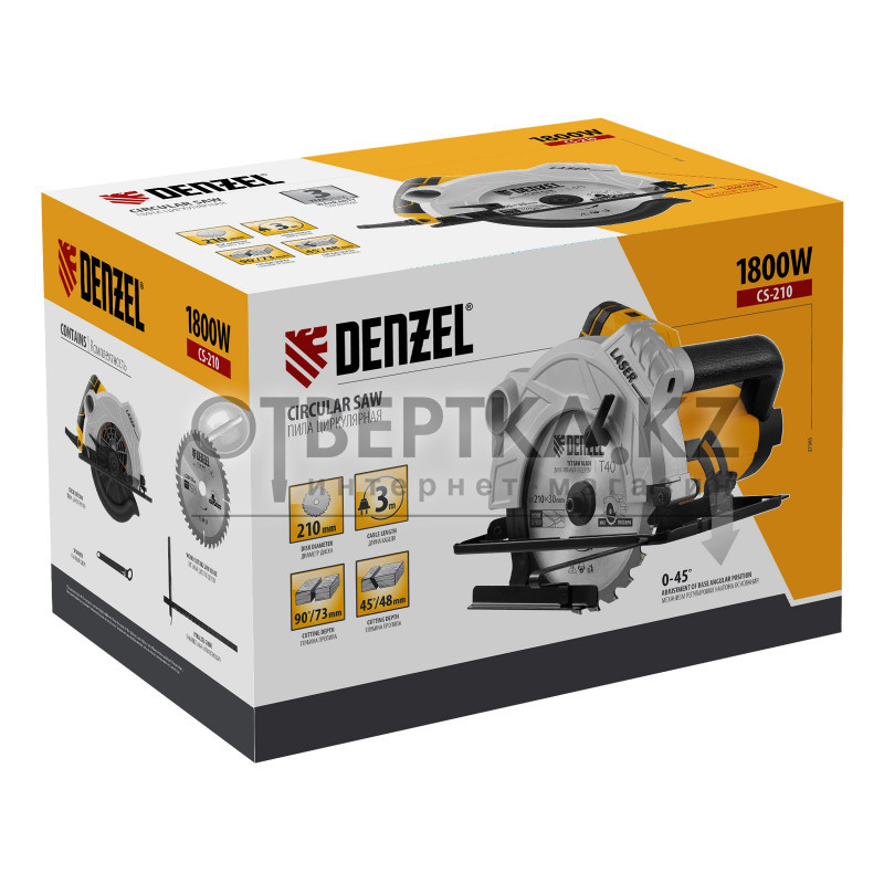 Циркулярная пила Denzel CS-210 27305 — мощная и производительная, имеет максимальную глубину реза в линейке Denzel CS — 73 мм, что обеспечивает эффективную работу с досками, фанерой, ДСП и другими листовыми древесными материалами.;Справляться с поставленными задачами помогают коллекторный двигатель мощностью 1,8 кВт, который обеспечивает частоту вращения 5000 об/мин, и пильный диск 210 х 3 мм. Глубина пропила регулируется до 73 мм, что позволяет работать с материалами разной толщины.