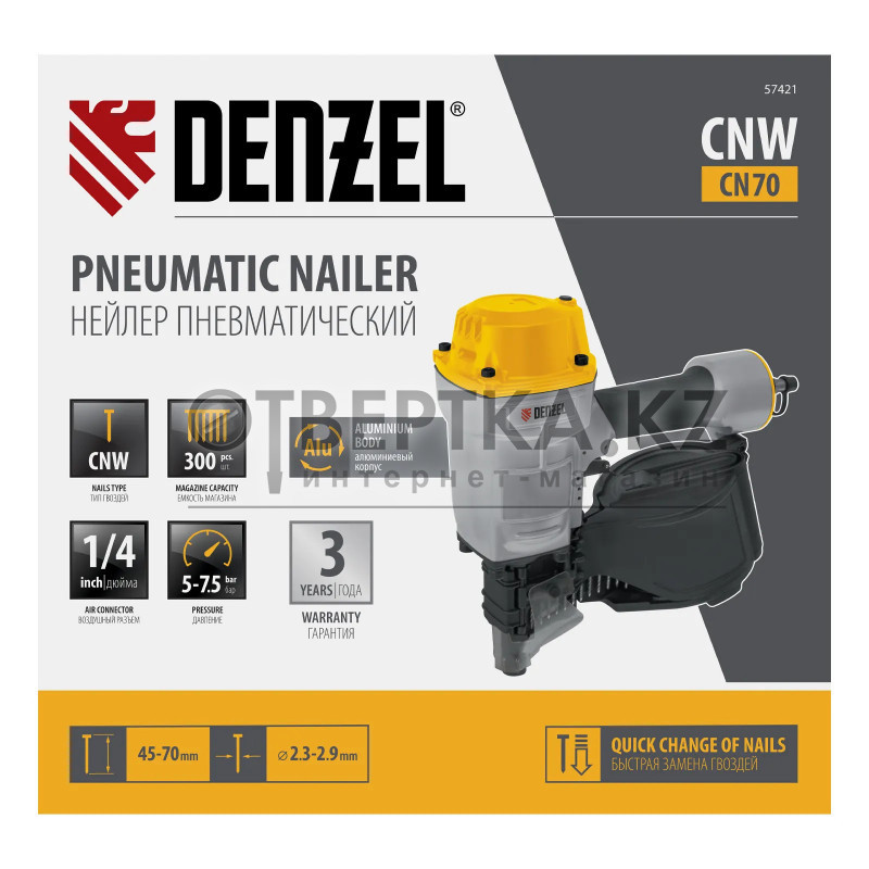 Пневматический нейлер Denzel CN70 57421 совместим с барабанными гвоздями типа CNW длиной 45-70 мм и предназначен для проведения строительно-ремонтных работ, а также производства мебели, паллет и других изделий из дерева, таких как тара и упаковка. Максимальное рабочее давление составляет 7,5 бар, что обеспечивает высокую скорость работы и позволяет быстро и эффективно решать поставленные задачи.