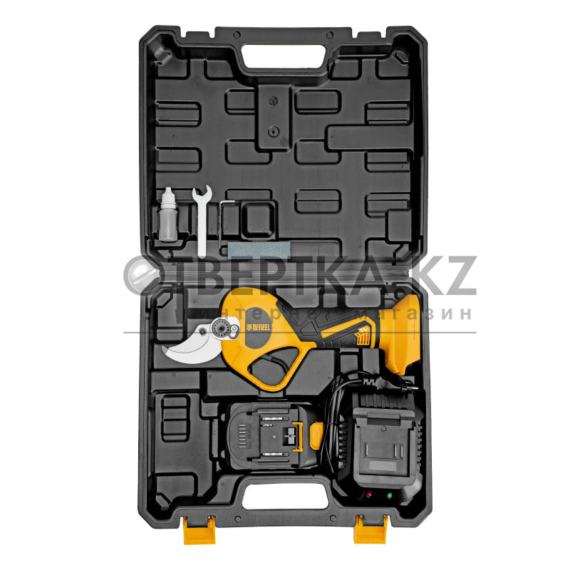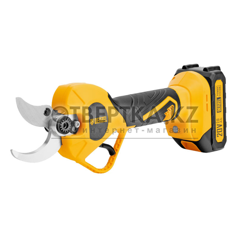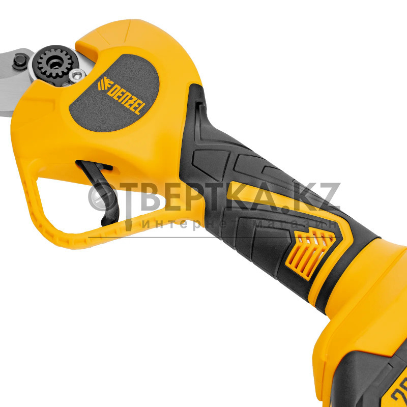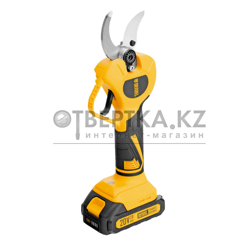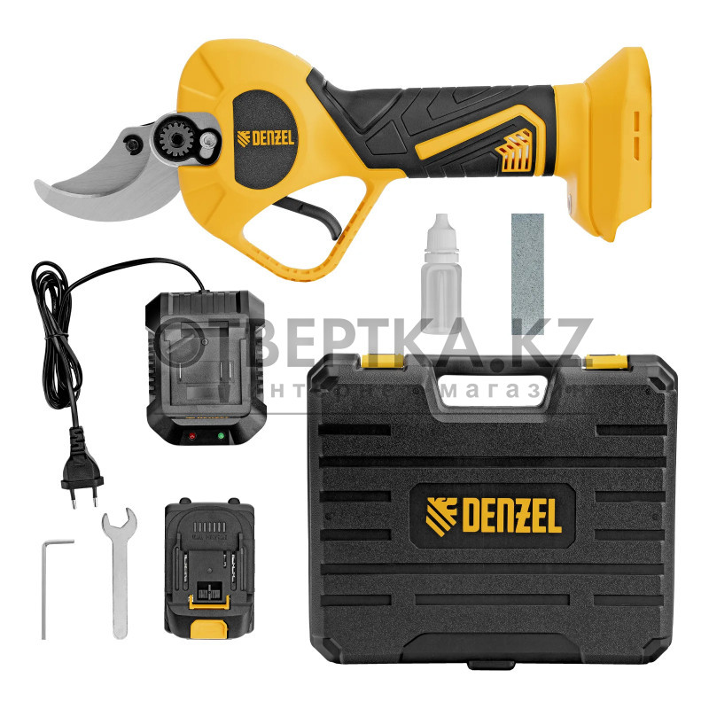 Контроль качества реза — зазор лезвий можно отрегулировать при необходимости.|Удобный контроль работы — на LCD-дисплее отображается количество срезов.|Термозащита — при превышении допустимой температуры двигатель останавливается, такое решение позволяет предотвратить его поломку.|Высокий ресурс — ячейки аккумулятора 10С с более высоким выходным током позволяют секатору хорошо справляться с большими нагрузками и обеспечивают длительный срок службы. |Универсальность — аккумулятор совместим со всеми инструментами единой платформы Denzel Power System 20V.|Контроль уровня заряда — индикатор поможет определить, когда необходима подзарядка.|Экономия заряда — если инструмент не используется в течение 5 минут, питание автоматически отключается.|Расширенные возможности — секатор совместим с телескопической рукояткой Denzel 58654 (1,3-2,8 м) для обрезки высоко расположенных веток.|Широкая комплектация — секатор поставляется с аккумулятором, зарядным устройством, гаечным и шестигранным ключами, масленкой и точильным камнем.|Удобное хранение и транспортировка — секатор с аксессуарами упакован в прочный кейс.