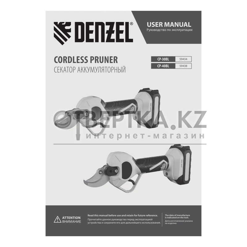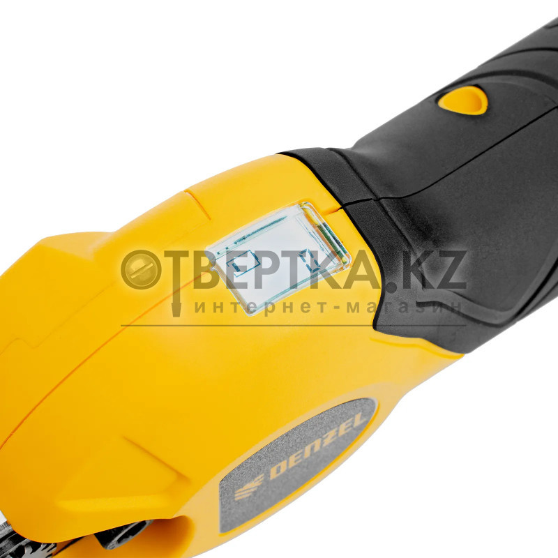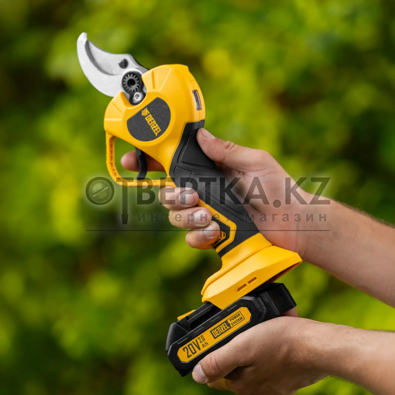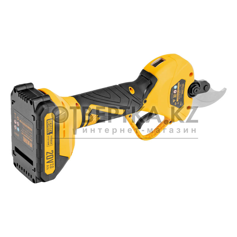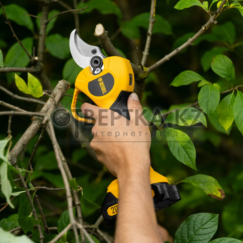 Контроль качества реза — зазор лезвий можно отрегулировать при необходимости.|Удобный контроль работы — на LCD-дисплее отображается количество срезов.|Термозащита — при превышении допустимой температуры двигатель останавливается, такое решение позволяет предотвратить его поломку.|Высокий ресурс — ячейки аккумулятора 10С с более высоким выходным током позволяют секатору хорошо справляться с большими нагрузками и обеспечивают длительный срок службы. |Универсальность — аккумулятор совместим со всеми инструментами единой платформы Denzel Power System 20V.|Контроль уровня заряда — индикатор поможет определить, когда необходима подзарядка.|Экономия заряда — если инструмент не используется в течение 5 минут, питание автоматически отключается.|Расширенные возможности — секатор совместим с телескопической рукояткой Denzel 58654 (1,3-2,8 м) для обрезки высоко расположенных веток.|Широкая комплектация — секатор поставляется с аккумулятором, зарядным устройством, гаечным и шестигранным ключами, масленкой и точильным камнем.|Удобное хранение и транспортировка — секатор с аксессуарами упакован в прочный кейс.