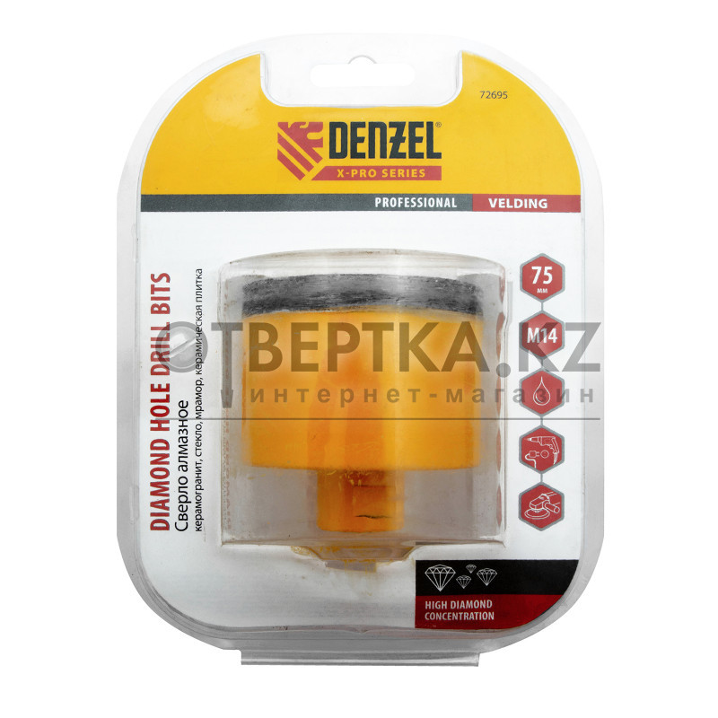Алмазное сверло Denzel 72695 диаметром 75 мм, с резьбой М14, предназначено для «мокрого» сверления по керамограниту, мрамору, стеклу и керамической плитке. Позволяет получать ровные отверстия без сколов, используется для проведения ремонтных и отделочных работ. Сверло (коронку) устанавливают на вал углошлифовальной машины, благодаря чему скорость сверления увеличивается в несколько раз по сравнению с дрелью или шуруповертом. Применение водяного охлаждения повышает срок службы оснастки. Чтобы точно позиционировать сверло при сверлении дрелью, рекомендуется использовать кондуктор (арт. 72830).