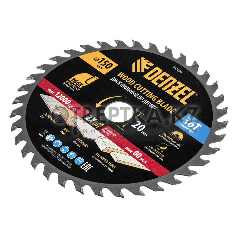 Пильный диск Denzel 733027 диаметром 150 x 20 мм, с 36 зубьями, предназначен для продольного и поперечного распила твердой и мягкой древесины, фанеры, МДФ, ДСП. 36 зубьев типа ATB с режущими пластинами оптимальной геометрии обеспечивают качественный рез. Тип реза — стандартный. Режущие пластины из твердого сплава YG6X сохраняют рабочие свойства при интенсивном использовании. Диск устанавливается на циркулярную, торцовочную пилу или на распиловочный станок. В комплект поставки входит переходное кольцо с 20 на 16 мм, что позволяет изменить посадочный размер и расширяет возможности использования диска.