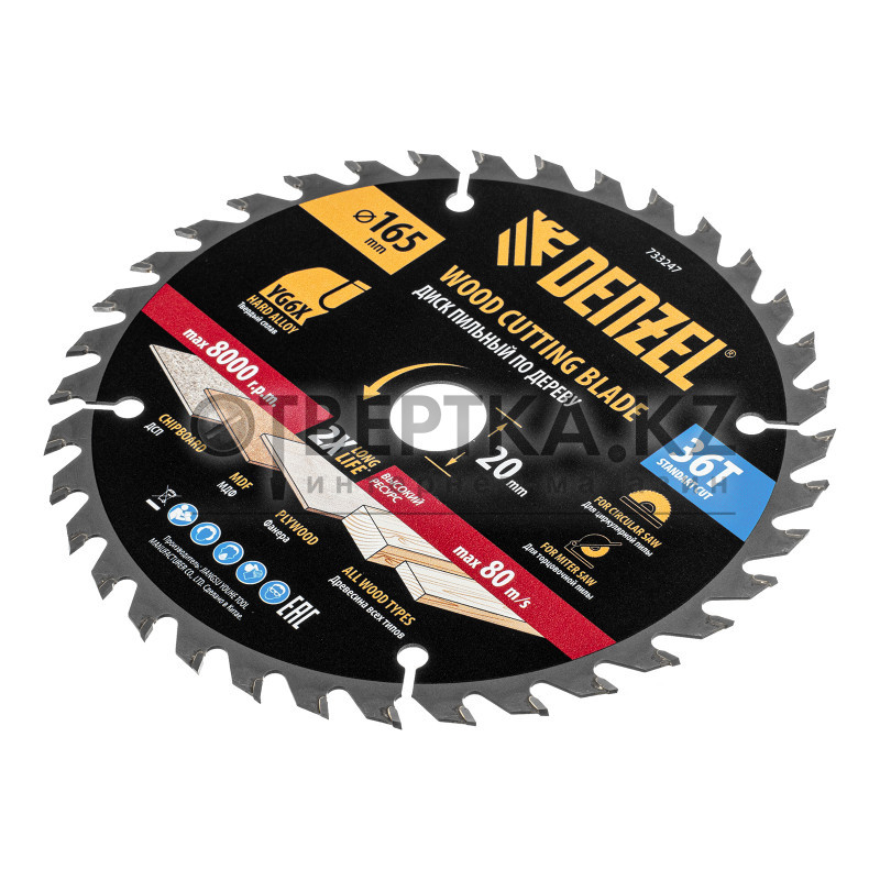 Пильный диск Denzel 733247 диаметром 165 x 20 мм, с 36 зубьями, предназначен для продольного и поперечного распила твердой и мягкой древесины, фанеры, МДФ, ДСП. 36 зубьев типа ATB с режущими пластинами оптимальной геометрии обеспечивают качественный рез. Тип реза — стандартный. Режущие пластины из твердого сплава YG6X сохраняют рабочие свойства при интенсивном использовании. Диск устанавливается на циркулярную, торцовочную пилу или на распиловочный станок. В комплект поставки входит переходное кольцо с 20 на 16 мм, что позволяет изменить посадочный размер и расширяет возможности использования диска.