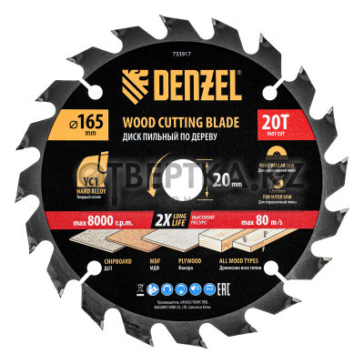 Пильный диск Denzel 733917 диаметром 165 x 20 мм, с 20 зубьями типа ATB, предназначен для быстрого продольного и поперечного распиливания древесины всех типов, в том числе с гвоздями и остатками бетона, а также ДСП, МДФ, фанеры. Режущие пластины из твердого сплава YC1, прошедшие многоступенчатую заточку, позволяют успешно справляться с прочными материалами. Диск устанавливается на циркулярную, торцовочную пилу или на распиловочный станок. В комплект поставки входит переходное кольцо 20/16 мм, позволяющее изменить посадочный диаметр при необходимости.