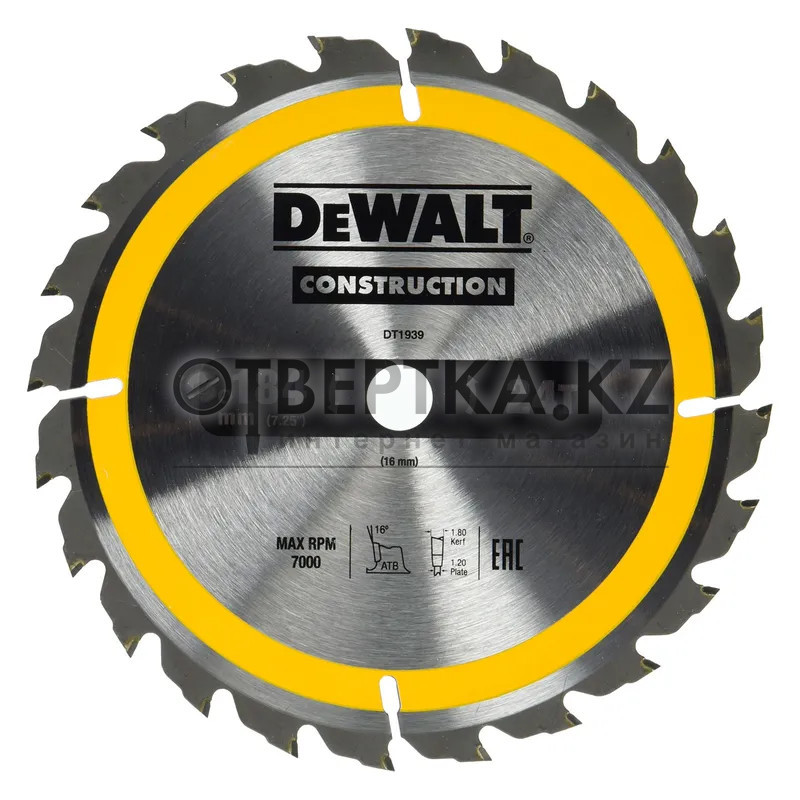 Диск пильный по дереву DeWALT CONSTRUCTION 184x1.6х16мм 24T DT1939-QZ - предназначен для реза сырой строительной древесины. Передний угол +10 градусов.