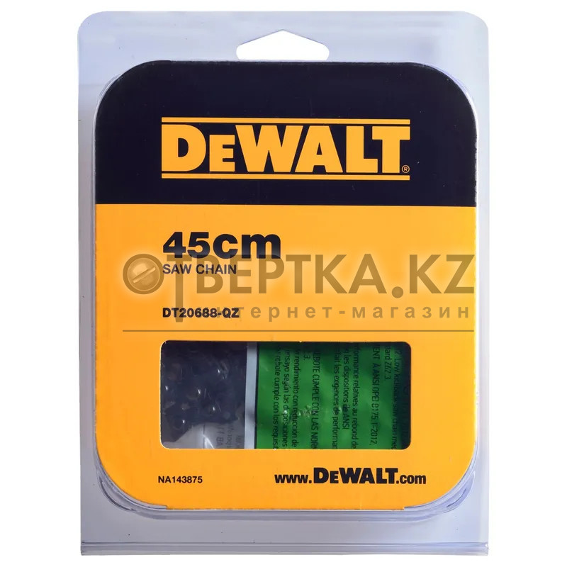 Цепь DeWALT 45см DT20688-QZ - высококачественная цепь DeWALT DT20688 длиной 45 см (18 дюймов) с 62 металлическими звеньями, шагом 3/8 дюйма, приводным звеном толщиной 1,3 мм. Цепь DeWALT DT20688 - ключевой компонент бензо-, электро- и аккумуляторных пил, используемых для распиливания древесины и других материалов. Пильная цепь относится к типу 91VXL. Изготовлена из высокопрочной стали, обеспечивающей долгий срок службы и высокую износостойкость. Подходит для пильных шин длиной 45 см.