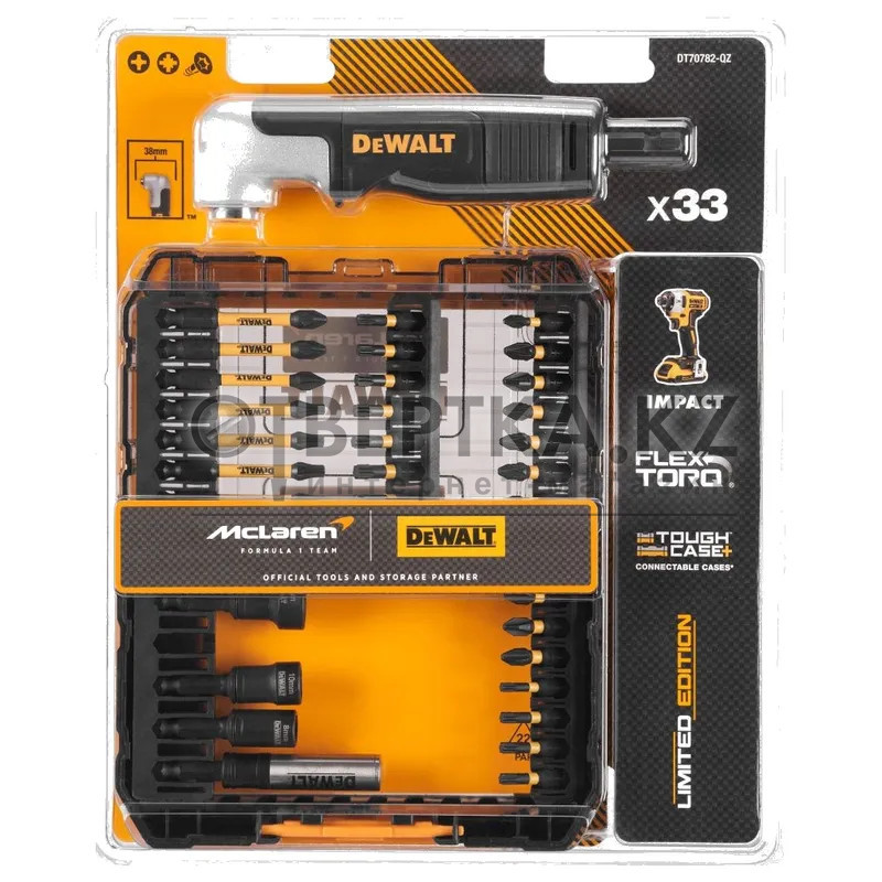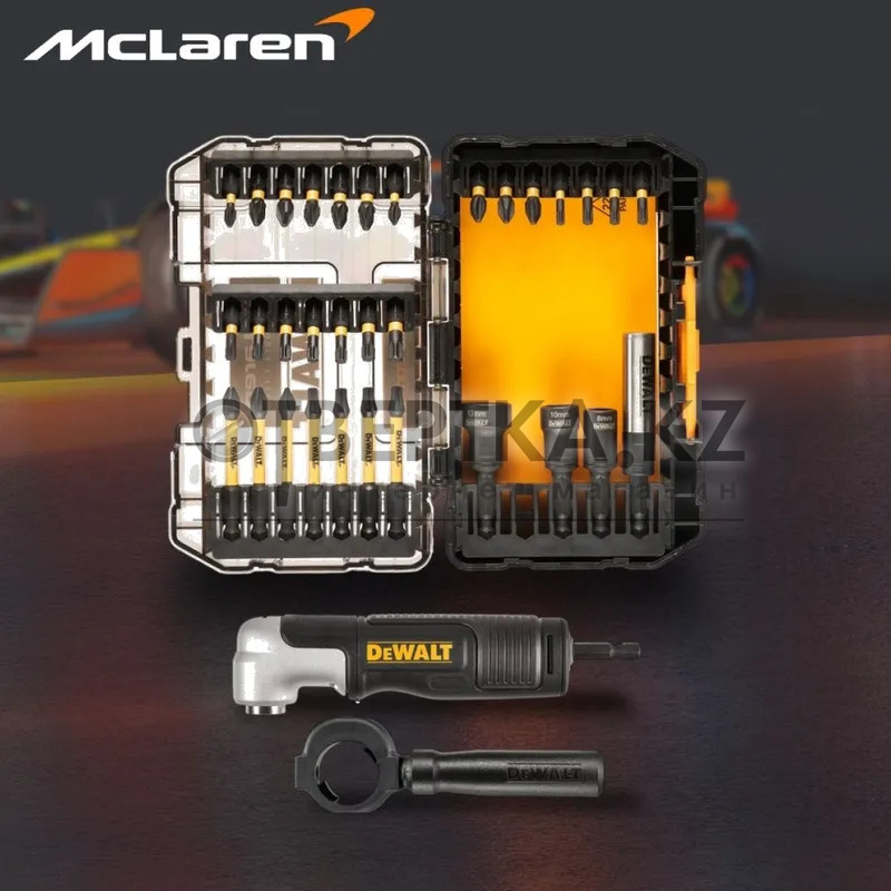 Набор бит и насадок DeWALT McLaren 33шт. DT70782-QZ - линейка DeWALT x McLaren F1 Team — это результат общего стремления к производительности. Является частью системы прочных кейсов DeWALT и полностью совместима со всеми комплектами прочных кейсов и системами хранения TSTAK. В этот набор из 33 предметов входит модульная угловая насадка Impact Ready, которая идеально подходит для доступа к крепежным элементам в ограниченном пространстве. В комплект входит: ударный торсионный адаптер Impact Ready, магнитный держатель бит, торцевые головки 8, 10, 13 мм, биты Impact Ready FLEXTORQ 57 мм PH1, PZ2 (2 шт.), T20, T25 (3 шт.), биты Impact Ready FLEXTORQ 25 мм - PH1, PH2 (3 шт.), PZ1, PZ2 (5 шт.), T15, T20 (5 шт.), T25 (3 шт.), T27, T30.