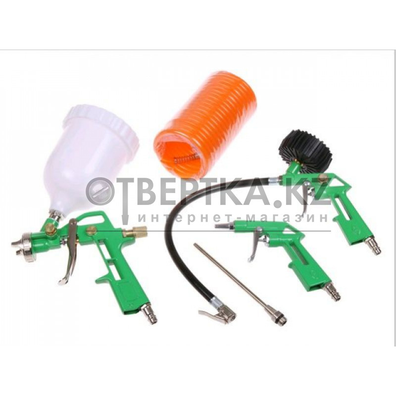 Базовый набор пневмоинструментов, состоящий из популярных компонентов, которые пригодятся начинающему пользователю воздушного компрессора. В набор входит краскораспылитель типа HVLP, пистолет для подкачки шин с манометром, продувочный пистолет для очистки поверхностей от пыли и сухой грязи, удлинительная насадка и спиральный пневматический шланг для подключения аксессуаров к компрессору.