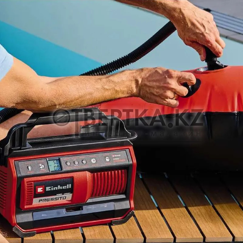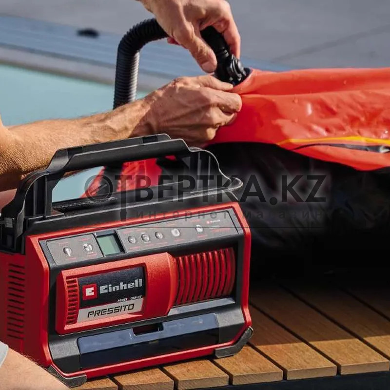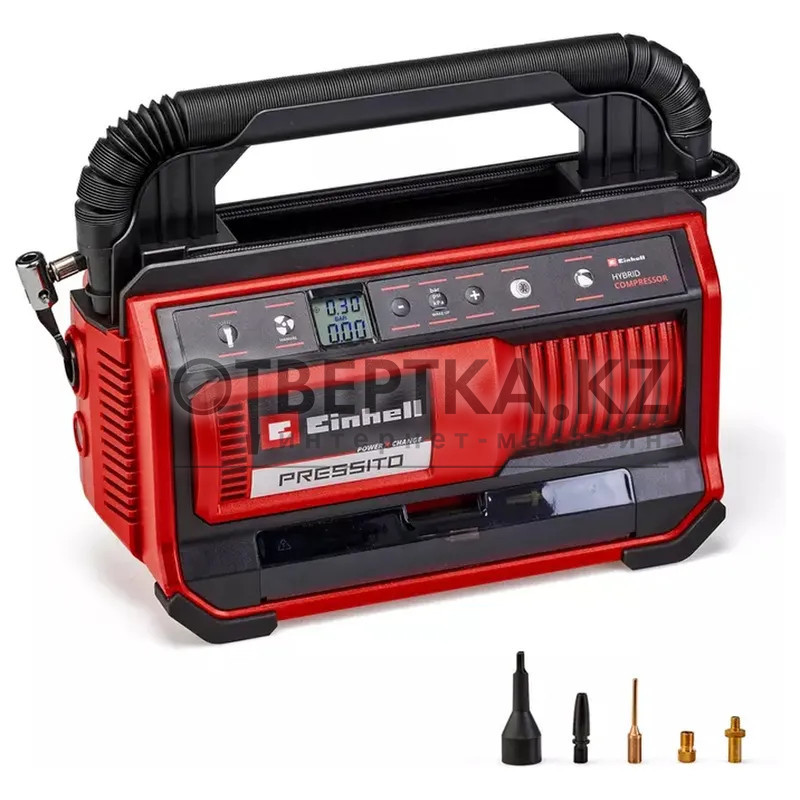 Компрессор аккумуляторный Einhell PRESSITO 18/25 Hybrid - Solo 4020430 - входит в семейство Power X-Change и работает от 18-вольтового аккумулятора либо от 220V сети. Компрессор оснащен насосом высокого и низкого давления. Устройство имеет ручку для переноски, что делает его удобным и функциональным помощником в дороге и дома. Кнопочный переключатель обеспечивает накачивание (высокое давление) без предварительной настройки давления. Фактическое и заданное давление отображается на двухстрочном дисплее в барах, фунтах на квадратный дюйм или кПа. При достижении требуемого давления, насос автоматически отключается. В комплект входит 3 адаптера: для шин, шаров и т.п. Все опции, а также шланги можно хранить во встроенных отсеках. На корпусе имеется встроенный фонарь для подсветки. В комплект поставки не входят аккумулятор и зарядное устройство (приобретаются отдельно).