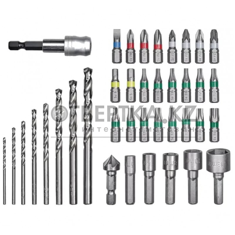 Биты 24шт.: PH1; PH2 2шт.; PZ1; PZ2 2шт.; PZ3; H4; H5; SL5; T10; T15 3шт.; T20 3шт.; T25 3шт.; T27; T30 2шт.; T40