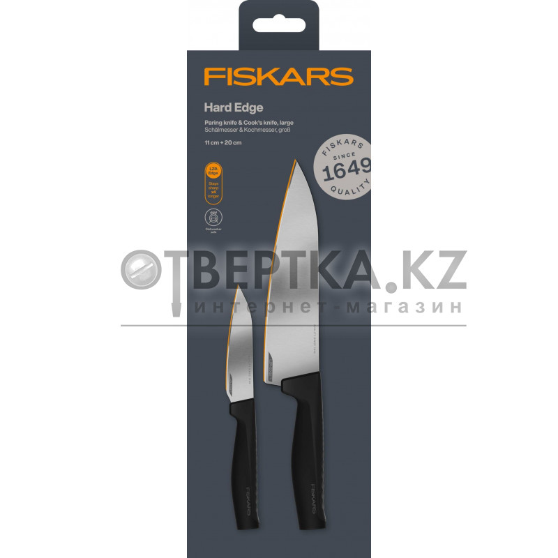 Набор состоит из поварского ножа Fiskars Hard Edge 20 см Fiskars (1051747) и Ножа для овощей Fiskars Hard Edge 11 см Fiskars (1051761)