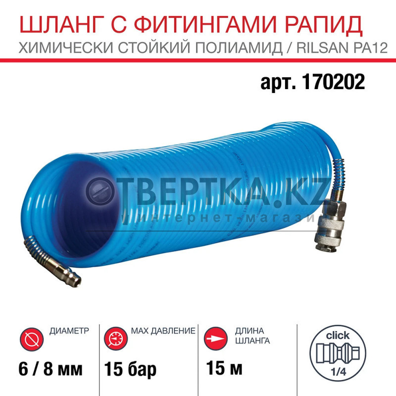 Шланг спиральный с фитингами RAPID — химически стойкий полиамидный шланг (Rilsan), предназначенный для подачи сжатого воздуха и работы с пневмоинструментом в профессиональных и промышленных условиях. Отличается высокой прочностью, устойчивостью к агрессивным средам и повышенным рабочим давлением.