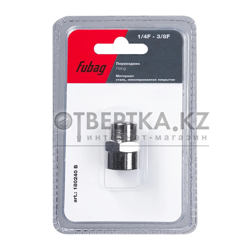 Переходник Fubag 180240 B для подключения пневмоинструмента. Переход с резьбы 1/4" (внутренняя) - 3/8" (внутренняя). Поставляется в блистере.