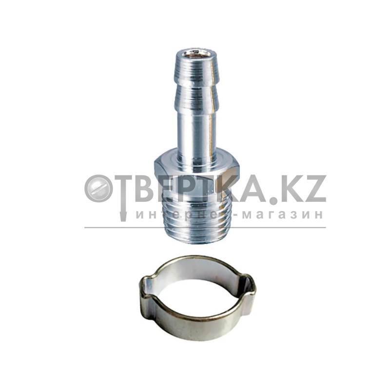 Коннектор Fubag 180261. Для соединения компрессора шлангом с пневмоинструментом. Крепление к инструменту - резьба 1/4" (папа), к шлангу - "елочка" (8 мм). Обжимное кольцо 8х13 мм в комплекте.