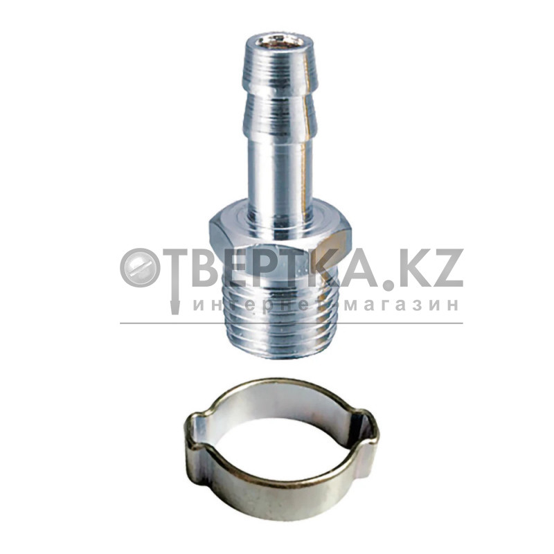 Коннектор Fubag 180263. Для соединения компрессора шлангом с пневмоинструментом. Крепление к инструменту - резьба 3/8" (папа), к шлангу - "елочка" (10 мм). Обжимное кольцо 10х15 мм в комплекте.