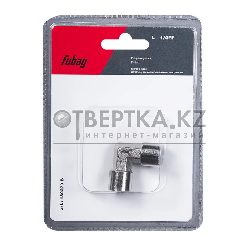 L-образный переходник (уголок) Fubag 180270 B соединяет участки пневмосистемы под углом 90°. Крепление - резьба 1/4". Поставляется в блистере.