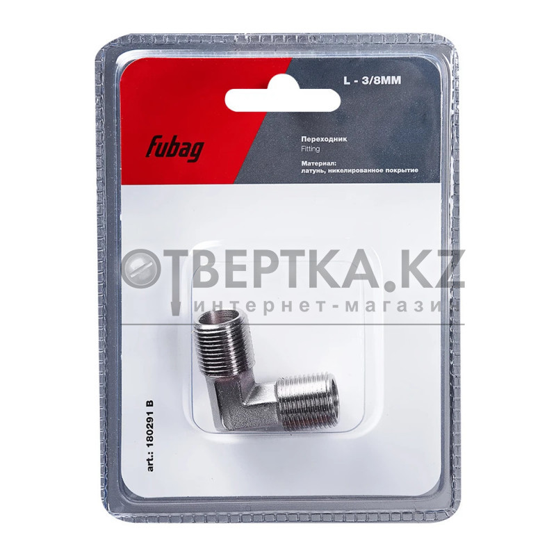 L-образный переходник (уголок) Fubag 180291 B соединяет участки пневмосистемы под углом 90°. Крепление - резьба 3/8". Поставляется в блистере.