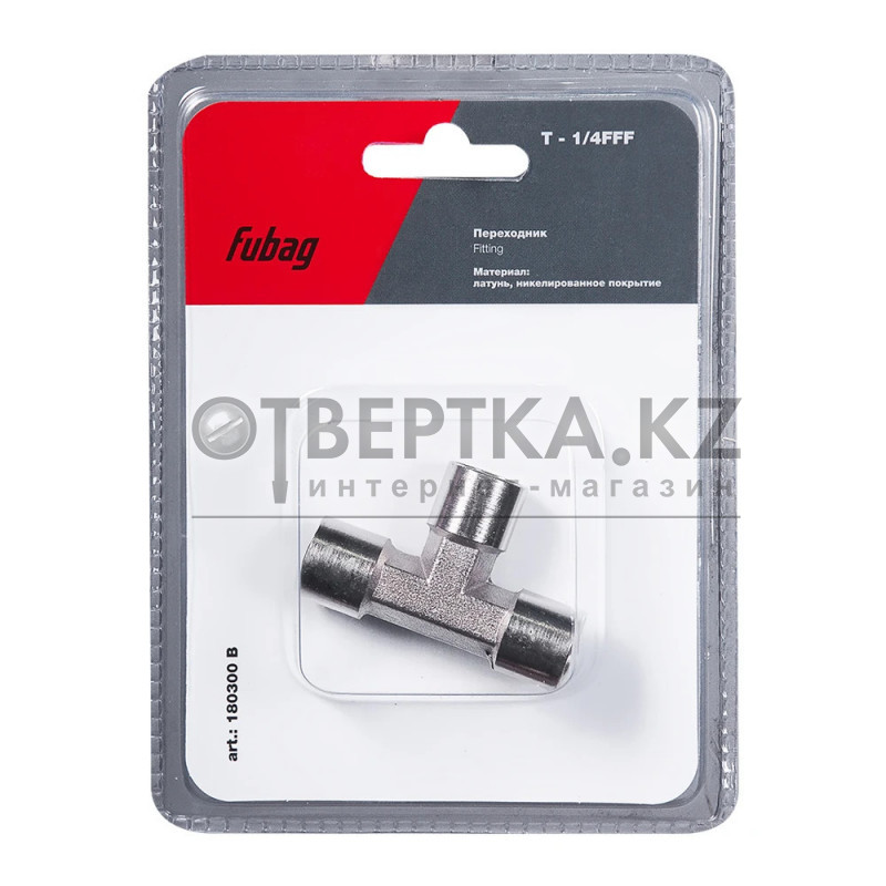 T-образный переходник (тройник) Fubag 180300 B позволяет подсоединить к пневмомагистрали дополнительный участок. Крепление - резьба 1/4". Поставляется в блистере.