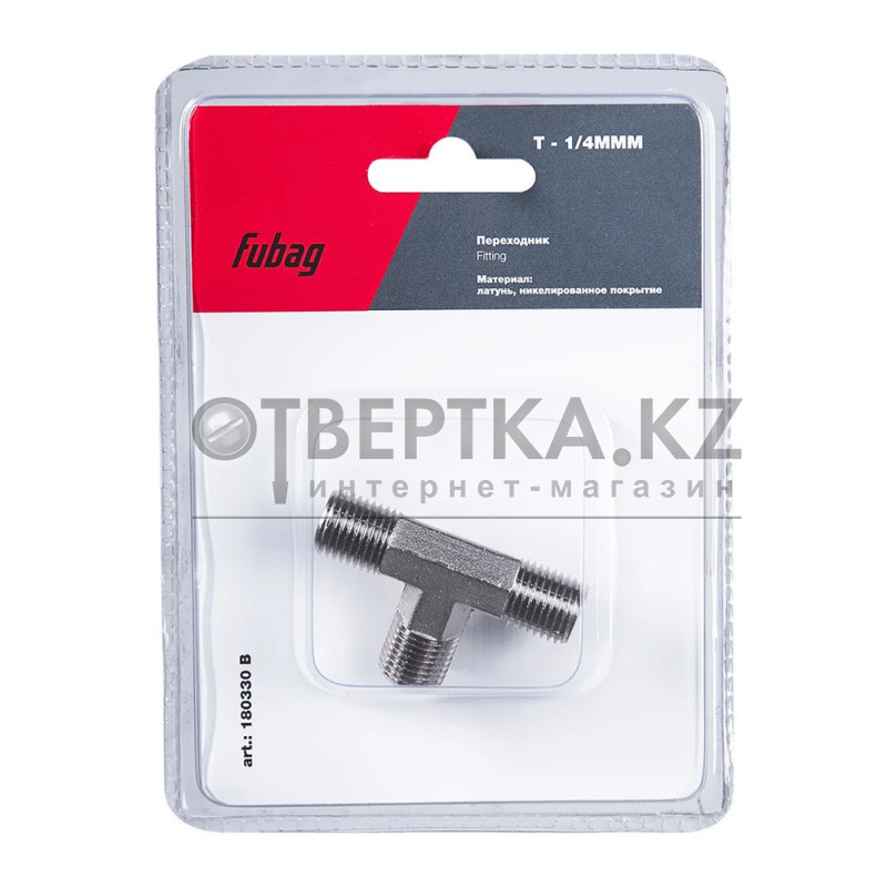 T-образный переходник (тройник) позволяет Fubag 180330 B подсоединить к пневмомагистрали дополнительный участок. Крепление - резьба 1/4". Поставляется в блистере.