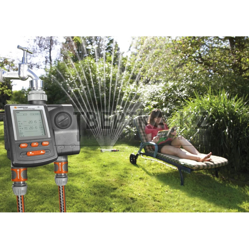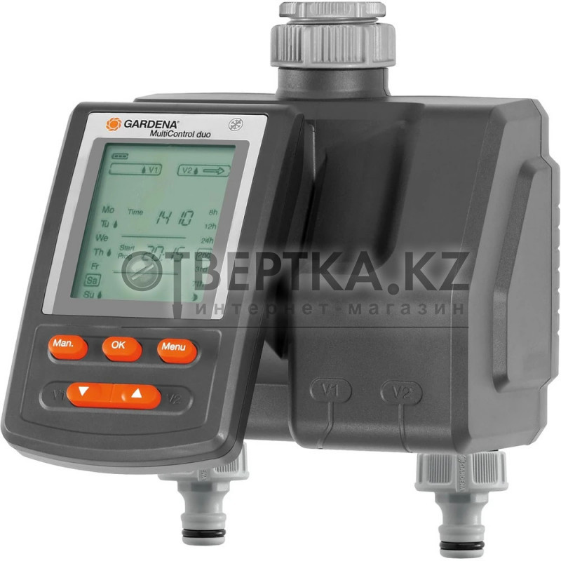 Gardena MultiControl duo 01874-20 — таймер подачи воды, предназначенный для автоматического полива двух участков сада. Модель оснащена большим дисплеем для удобства программирования и отсоединяемой панелью управления для комфортного задания параметров полива.