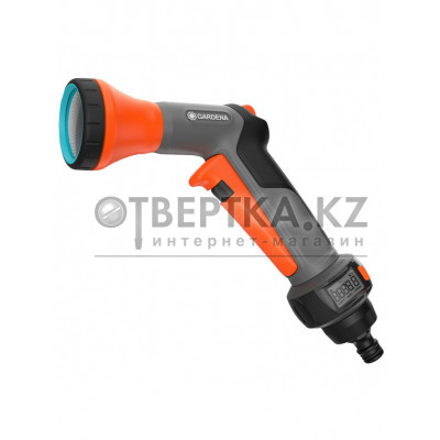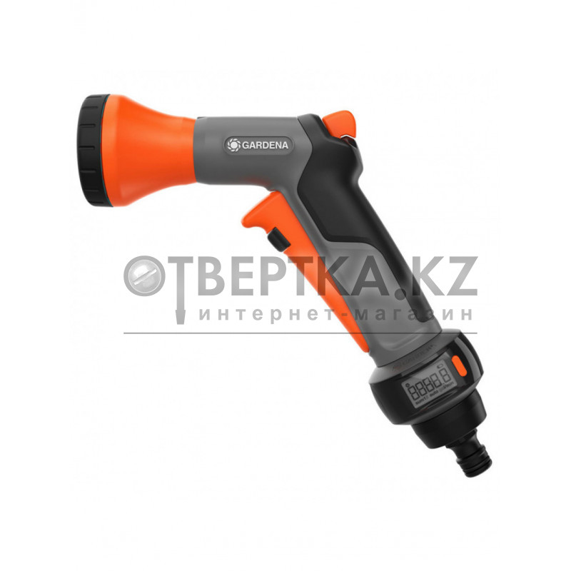 Пистолет-наконечник Gardena AquaCount 18352 для садового полива. Садовый пистолет Гардена с установленным счетчиком расхода воды. Вид струи - широкий мягкий, наиболее комфортный для цветов и растений душ, Напор воды от садового водопровода регулируется клавишей или регулировочным флажком.