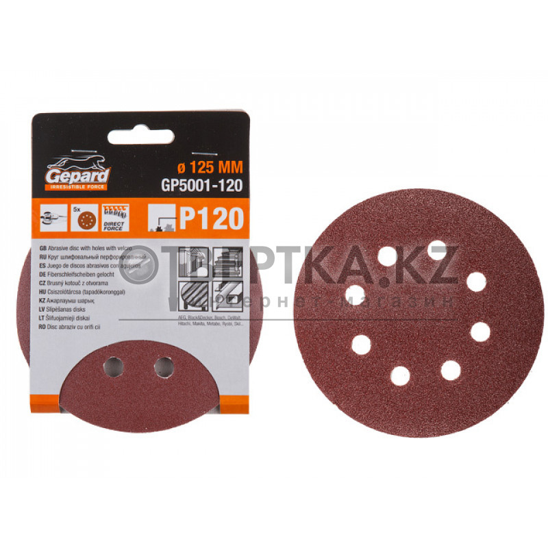 Схожий товар (без отверстий): GP5014-40 Шлифлист 125мм круг Р40 д/дерева 5шт. GEPARD (GP5014-40)