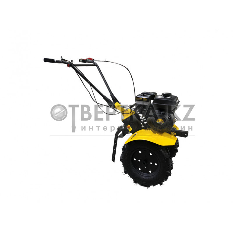 Объем топливного бака составляет 3,6 л, а средний расход топлива — около 375 гр/кВт в час, что делает эксплуатацию агрегата экономически выгодной. Прочная шестерёнчато-цепная трансмиссия и чугунный корпус редуктора гарантируют долговечность и устойчивость механизма к повышенным нагрузкам. Двухступенчатая коробка передач (2 передачи вперёд, 1 передача назад) обеспечивает оптимальную скорость движения и эффективность обработки. Колеса размером 4x10 позволяют уверенно передвигаться по различным видам почвенных покрытий. Ширина захвата обрабатываемой полосы достигает 100 см, что значительно ускоряет выполнение работ на больших площадях. Диаметр используемых фрез равен 30 см, что способствует глубокому проникновению в грунт и качественному перемешиванию верхнего слоя почвы. Машина оборудована приводом активного навесного оборудования посредством ремня, что упрощает подключение различного вспомогательного инструмента. Удобство управления машиной обеспечено продуманным расположением органов управления и рукояток. Мотоблок относится к классу средней тяжести, общий вес устройства составляет 77,8 кг, что даёт возможность перемещать технику вручную.